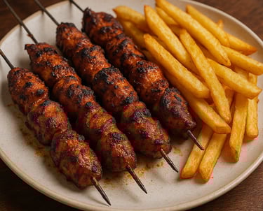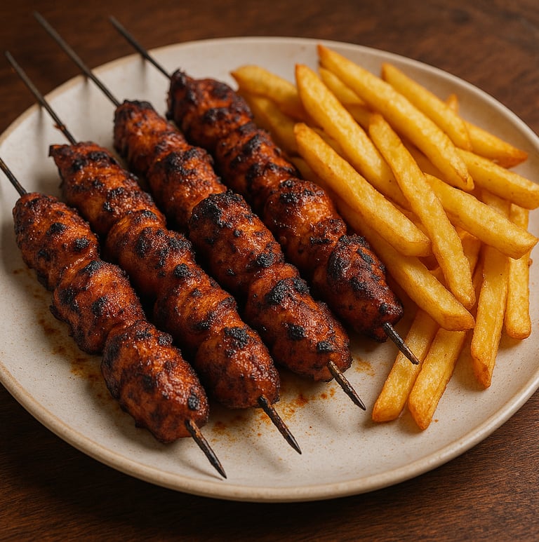 Des brochettes de poulet marinées dans des épices africaines, grillées au charbon, accompagnées de frites maison croustillantes. Parfait pour les amateurs de viande et de street food africaine.