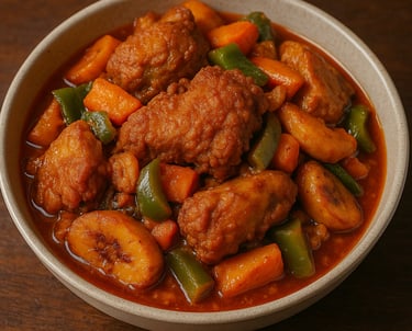 Un plat prestigieux à base de poulet frit, de légumes sautés et de plantains mûrs. Le tout est mijoté dans une sauce tomate légèrement épicée. Il incarne l’hospitalité et l’élégance culinaire camerounaise.